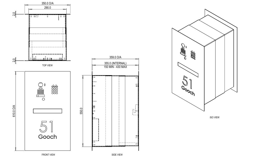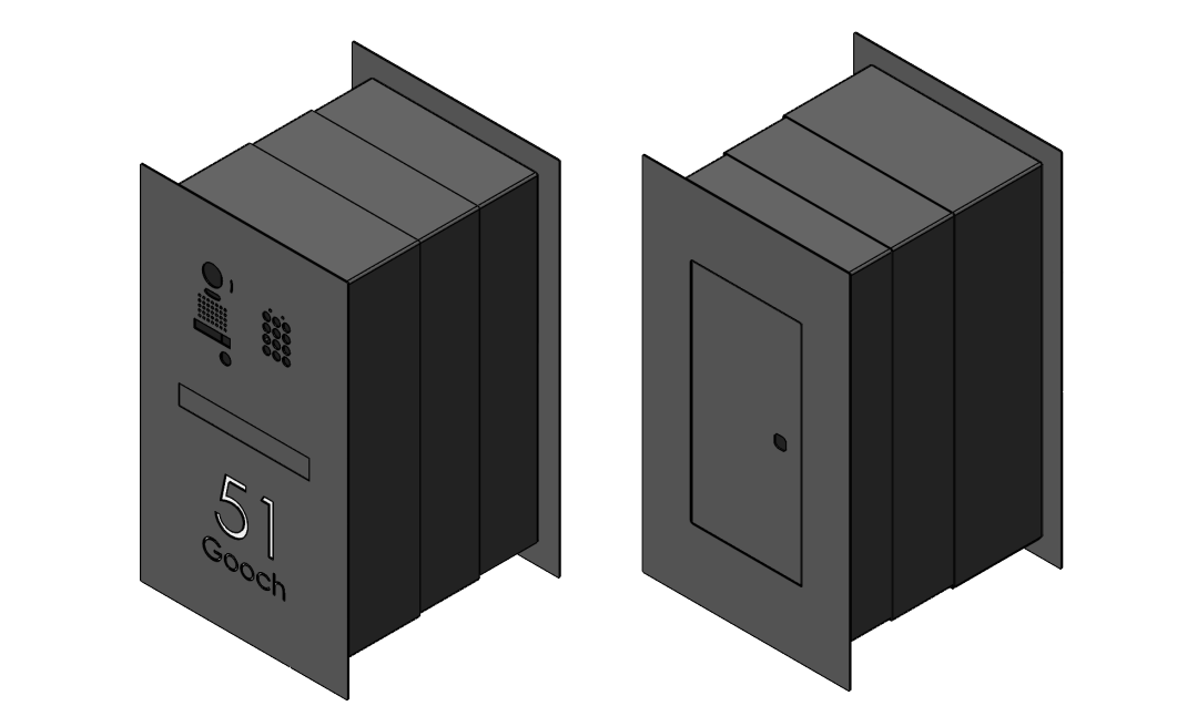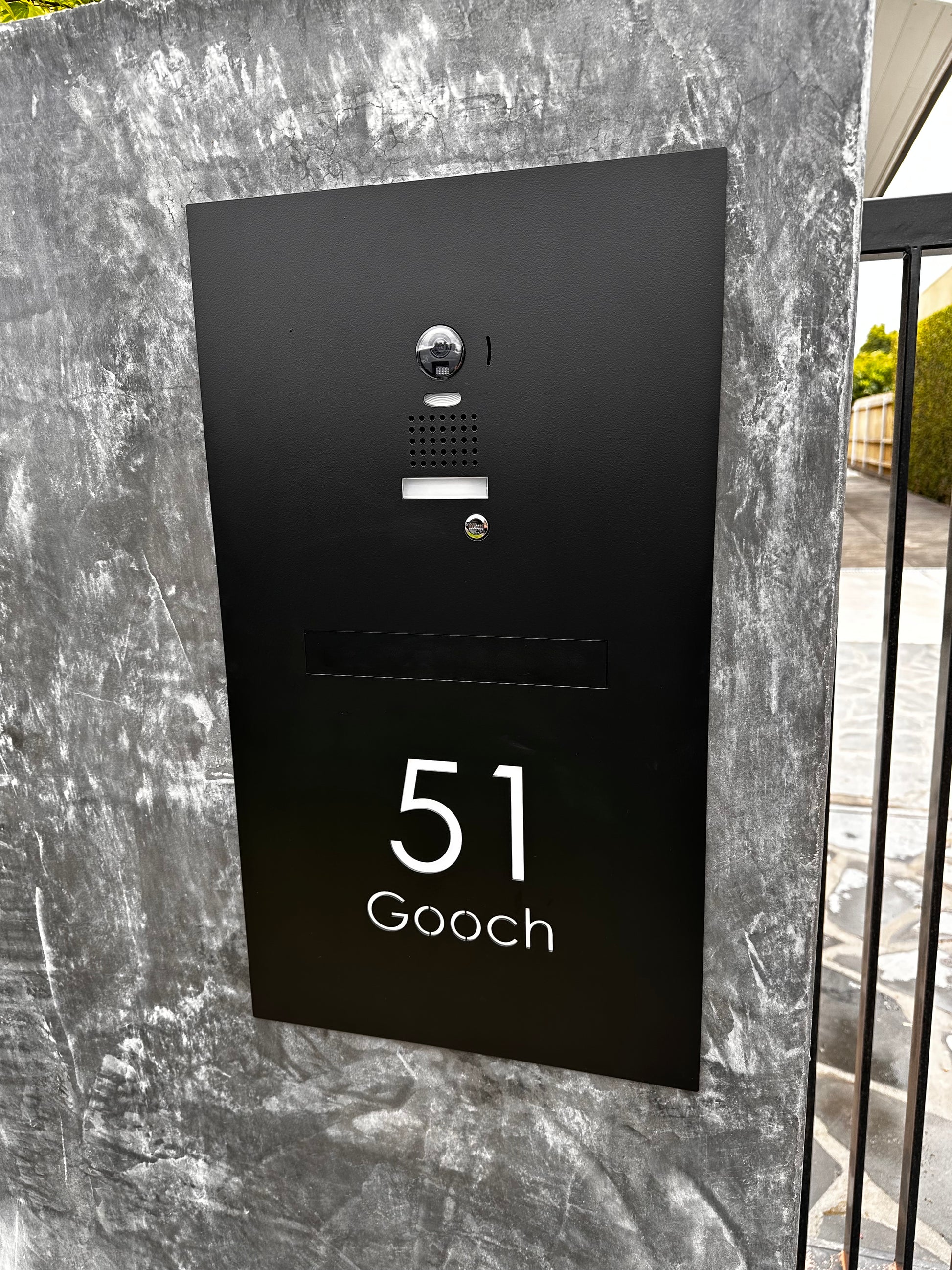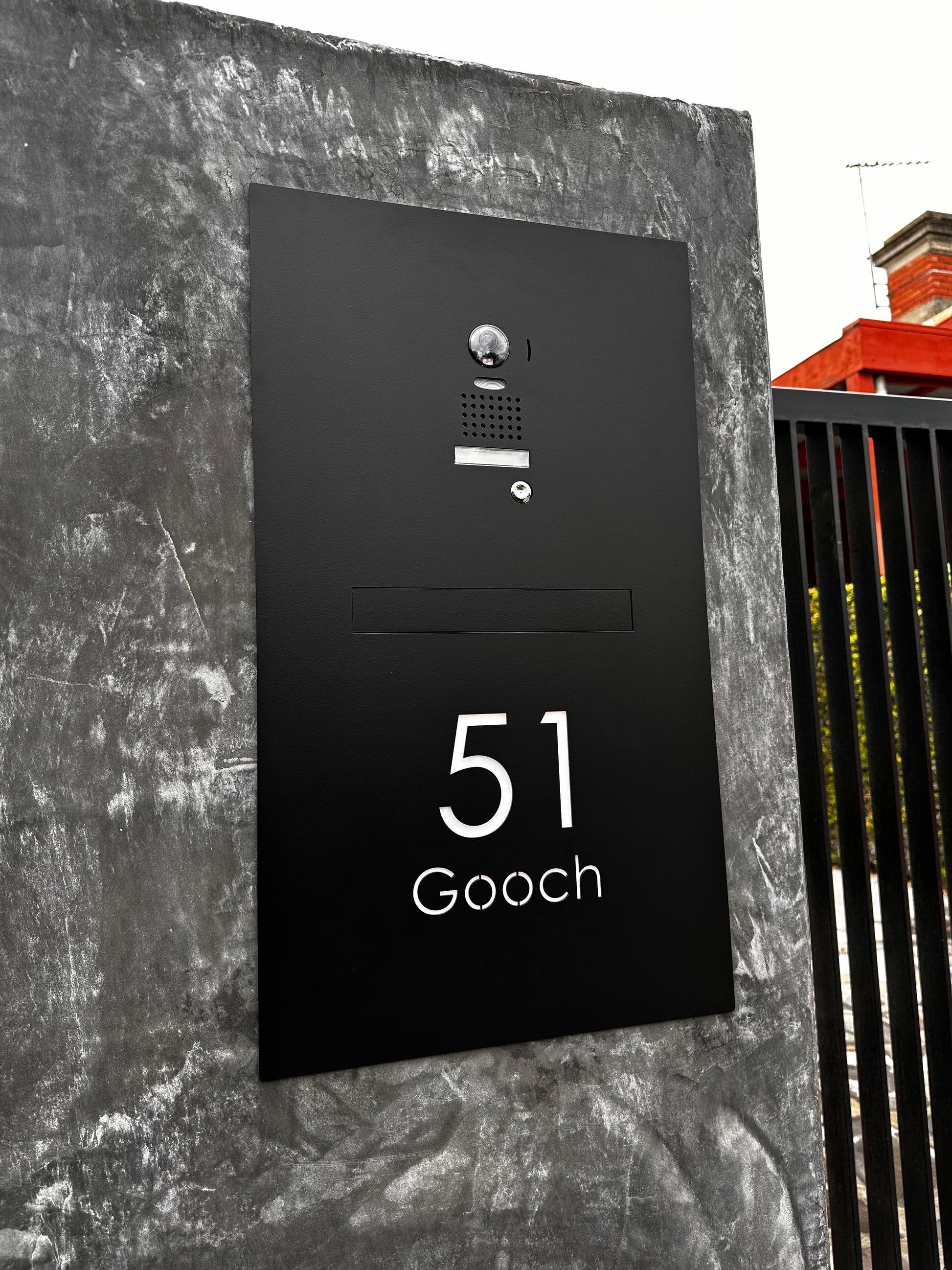 A custom-made letter box with intercom and keypad integration and the option to further customise by having your street number and name.